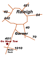 Go Slow Tow is located on 401 South, near Wake Tech Community College.
